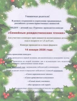 14 января 2026 года в рамках сохранения и укрепления традиционных российских духовно-нравственных ценностей в МБДОУ – детский сад «Теремок» проводится конкурс «Семейные рождественские чтения».